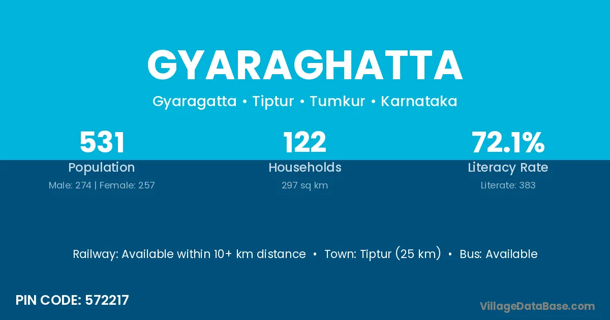 Tiptur (25 km) is the nearest town to Gyaraghatta village for major economic activities and is located approximately 25 km away.