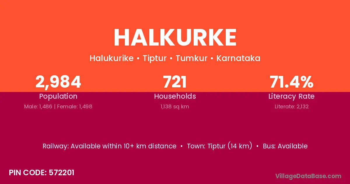 Tiptur (14 km) is the nearest town to Halkurke village for major economic activities and is located approximately 14 km away.