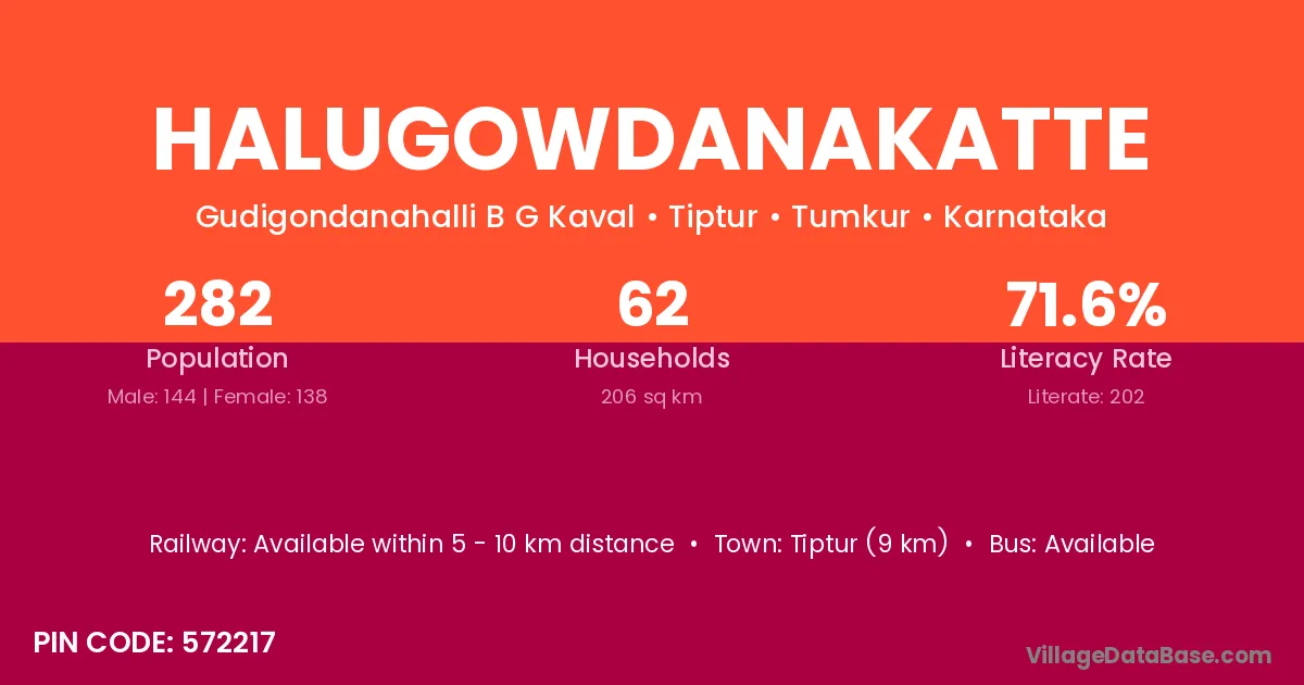 Tiptur (9 km) is the nearest town to Halugowdanakatte village for major economic activities and is located approximately 9 km away.