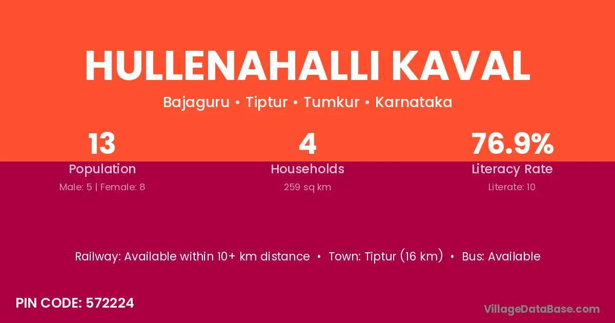 Tiptur (16 km) is the nearest town to Hullenahalli Kaval village for major economic activities and is located approximately 16 km away.