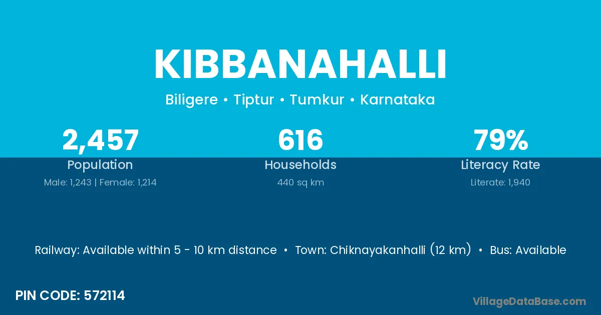 Chiknayakanhalli (12 km) is the nearest town to Kibbanahalli village for major economic activities and is located approximately 12 km away.