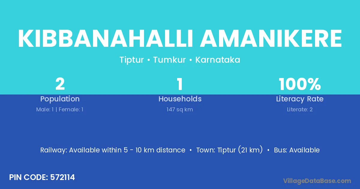 Tiptur (21 km) is the nearest town to Kibbanahalli Amanikere village for major economic activities and is located approximately 21 km away.