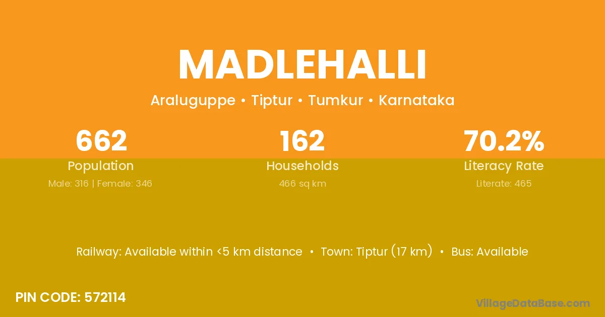 Tiptur (17 km) is the nearest town to Madlehalli village for major economic activities and is located approximately 17 km away.