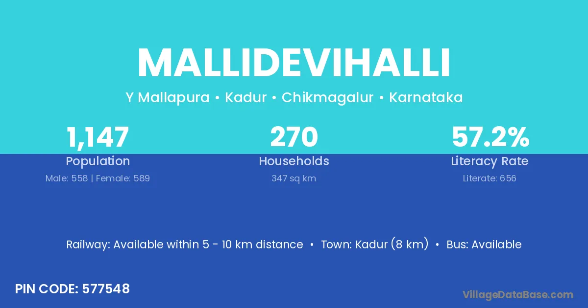 Tiptur (27 km) is the nearest town to Mallidevihalli village for major economic activities and is located approximately 27 km away.