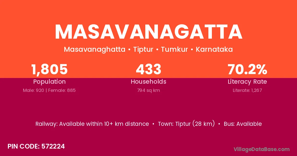 Tiptur (28 km) is the nearest town to Masavanagatta village for major economic activities and is located approximately 28 km away.