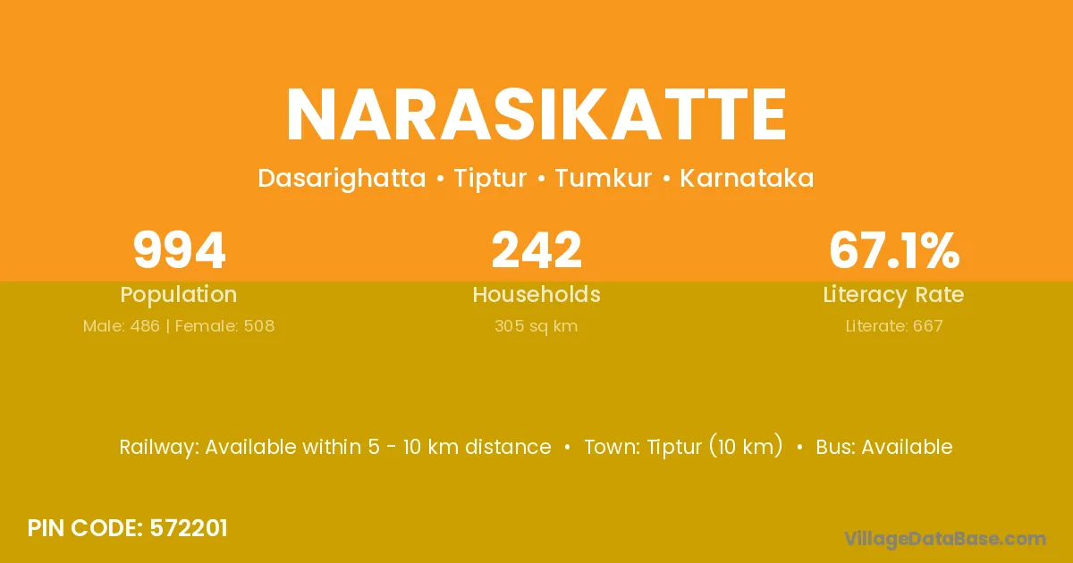 Tiptur (10 km) is the nearest town to Narasikatte village for major economic activities and is located approximately 10 km away.