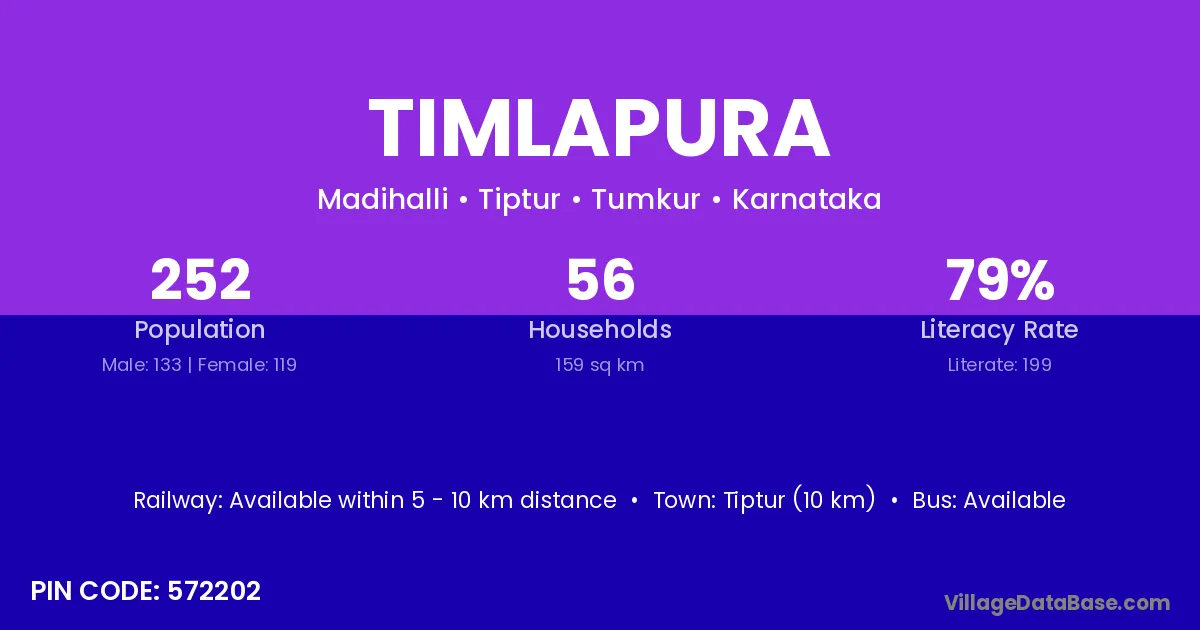 Tiptur (10 km) is the nearest town to Timlapura village for major economic activities and is located approximately 10 km away.