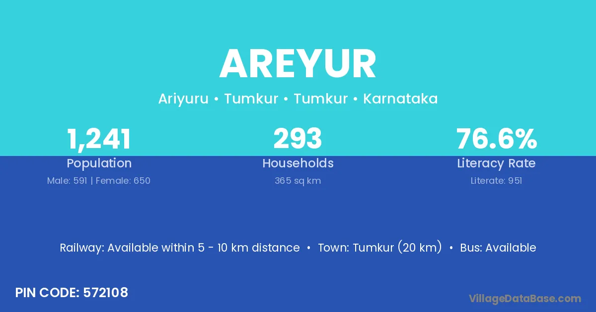 Tumkur (20 km) is the nearest town to Areyur village for major economic activities and is located approximately 20 km away.