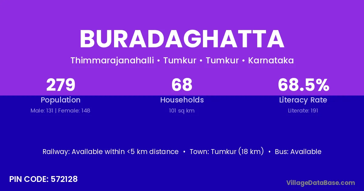 Tumkur (18 km) is the nearest town to Buradaghatta village for major economic activities and is located approximately 18 km away.
