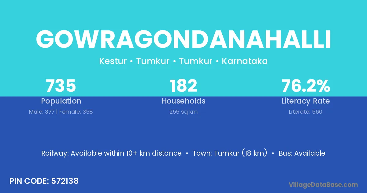 Tumkur (18 km) is the nearest town to Gowragondanahalli village for major economic activities and is located approximately 18 km away.