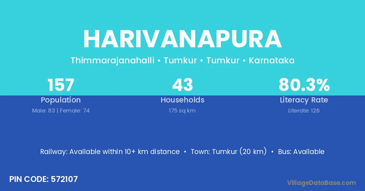 Tumkur (20 km) is the nearest town to Harivanapura village for major economic activities and is located approximately 20 km away.