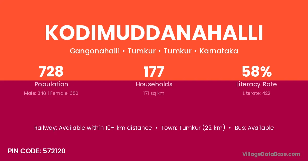 Tumkur (22 km) is the nearest town to Kodimuddanahalli village for major economic activities and is located approximately 22 km away.