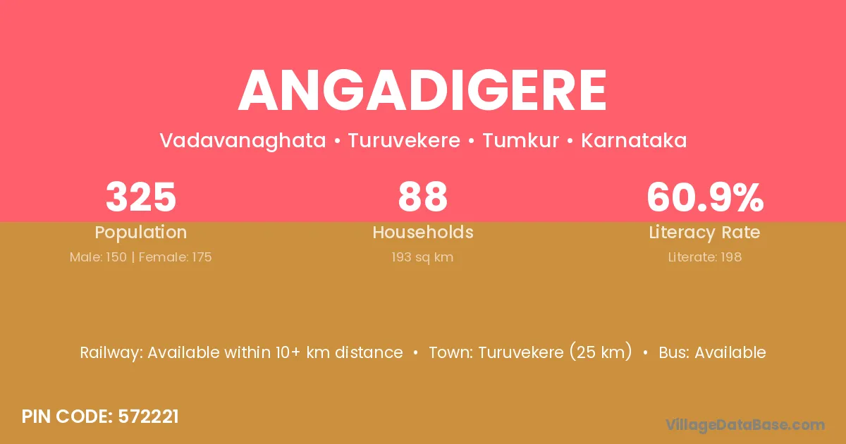 Turuvekere (25 km) is the nearest town to Angadigere village for major economic activities and is located approximately 25 km away.