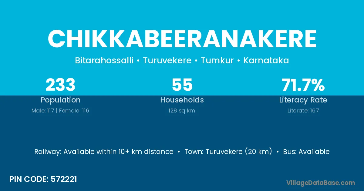 Chikkabeeranakere village has a total population of 233 people, of which 117 are males and 116 are females.