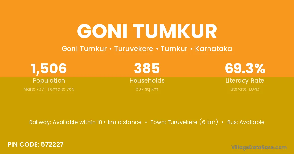 Turuvekere (6 km) is the nearest town to Goni Tumkur village for major economic activities and is located approximately 6 km away.