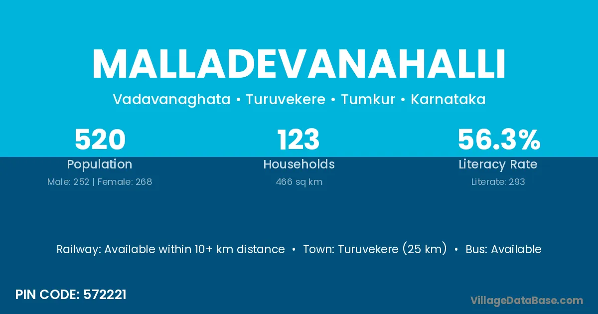 Turuvekere (25 km) is the nearest town to Malladevanahalli village for major economic activities and is located approximately 25 km away.