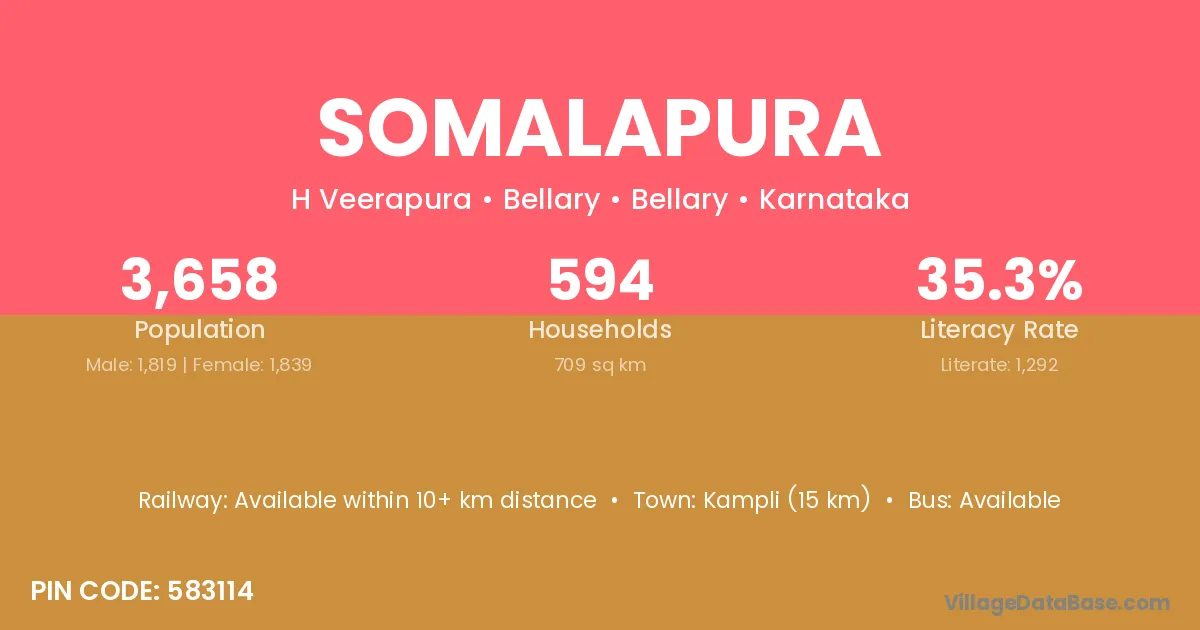 The literacy rate of Somalapura village is 77.90%. Male literacy stands at 83.07% and female literacy at 72.64%.