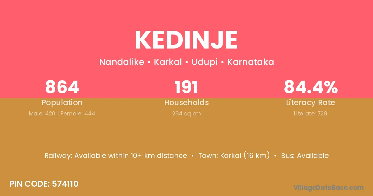 Karkal (16 km) is the nearest town to Kedinje village for major economic activities and is located approximately 16 km away.