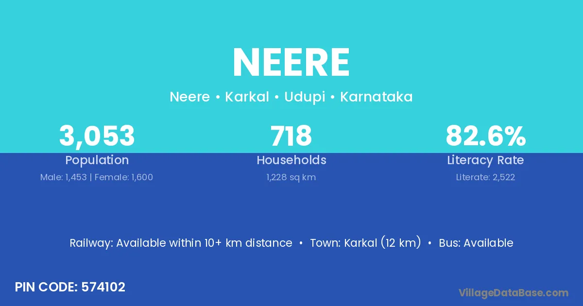 Karkal (12 km) is the nearest town to Neere village for major economic activities and is located approximately 12 km away.