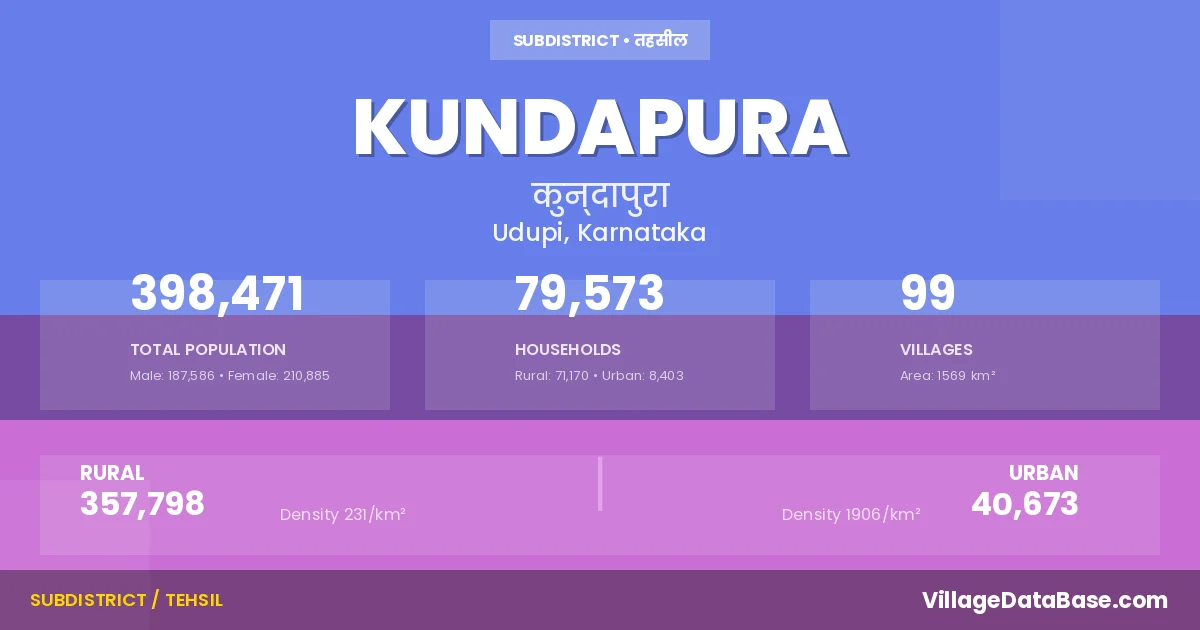 According to the 2011 census The total area of Kundapura Taluka is 1569 km², with a population of 398471 people. The population density is 254 inhabitants per square kilometre, and there are approximately 79573 houses in the sub district.