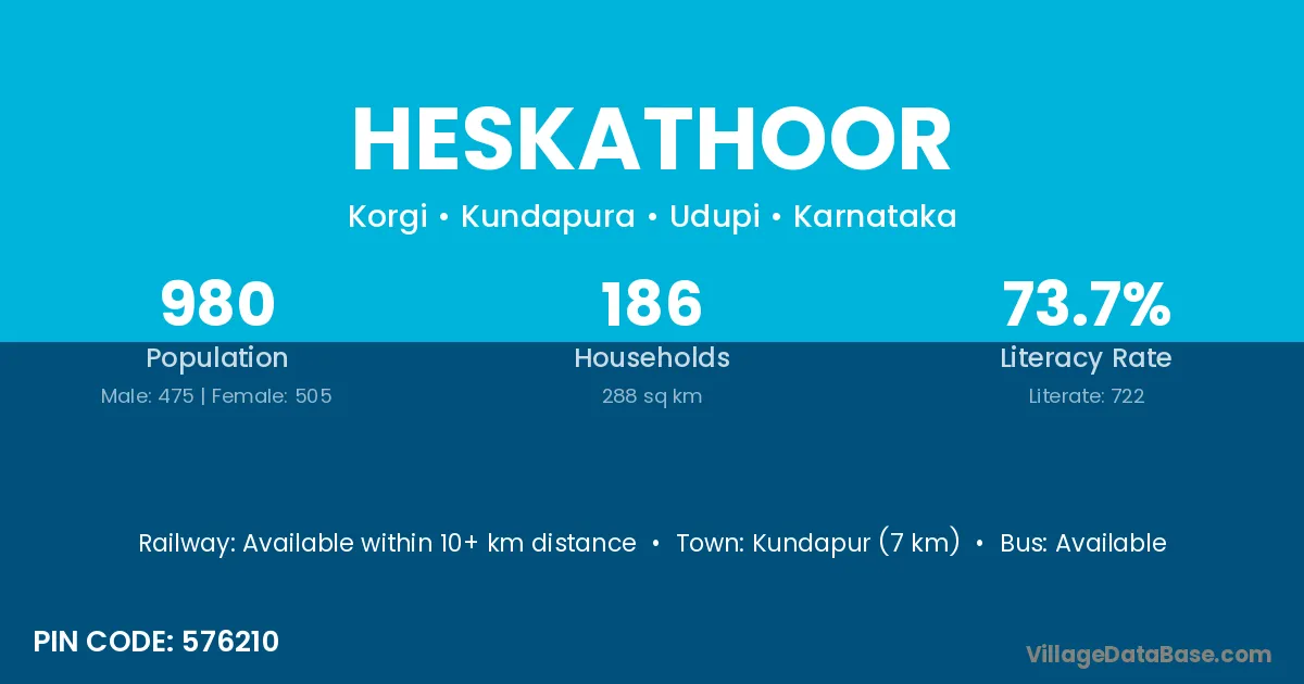 Kundapur (7 km) is the nearest town to Heskathoor village for major economic activities and is located approximately 7 km away.