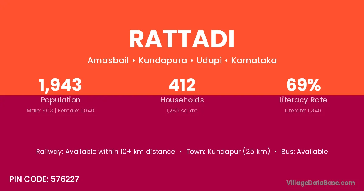 Kundapur (25 km) is the nearest town to Rattadi village for major economic activities and is located approximately 25 km away.