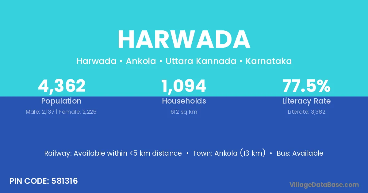 Ankola (13 km) is the nearest town to Harwada village for major economic activities and is located approximately 13 km away.