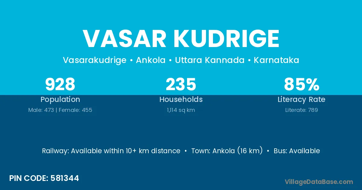 Ankola (16 km) is the nearest town to Vasar Kudrige village for major economic activities and is located approximately 16 km away.