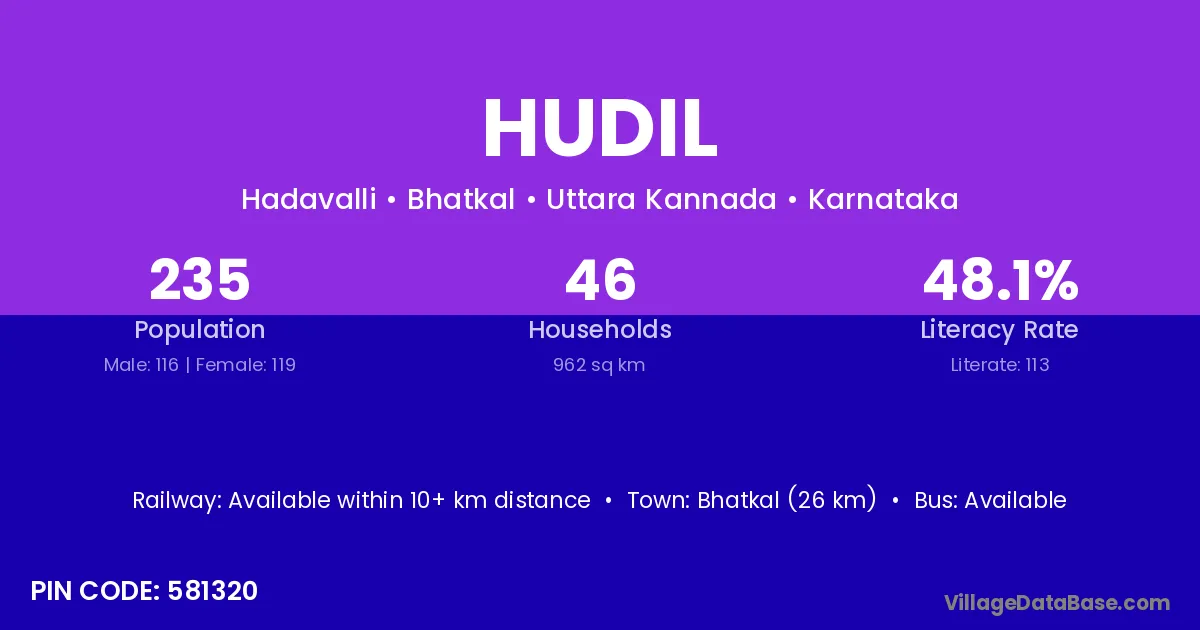 Bhatkal (26 km) is the nearest town to Hudil village for major economic activities and is located approximately 26 km away.