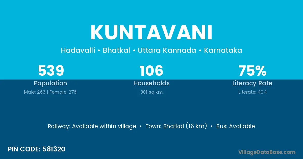 Bhatkal (16 km) is the nearest town to Kuntavani village for major economic activities and is located approximately 16 km away.