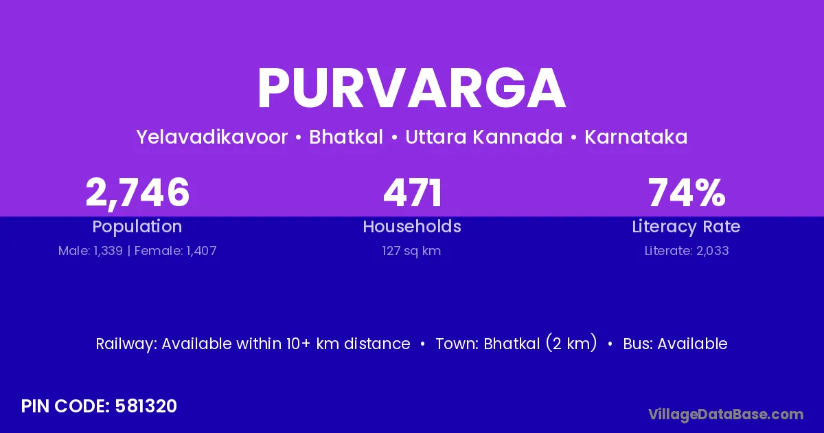 Bhatkal (2 km) is the nearest town to Purvarga village for major economic activities and is located approximately 2 km away.