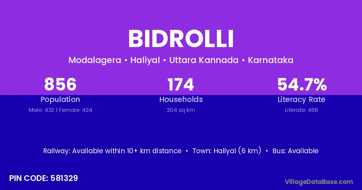 Haliyal (6 km) is the nearest town to Bidrolli village for major economic activities and is located approximately 6 km away.