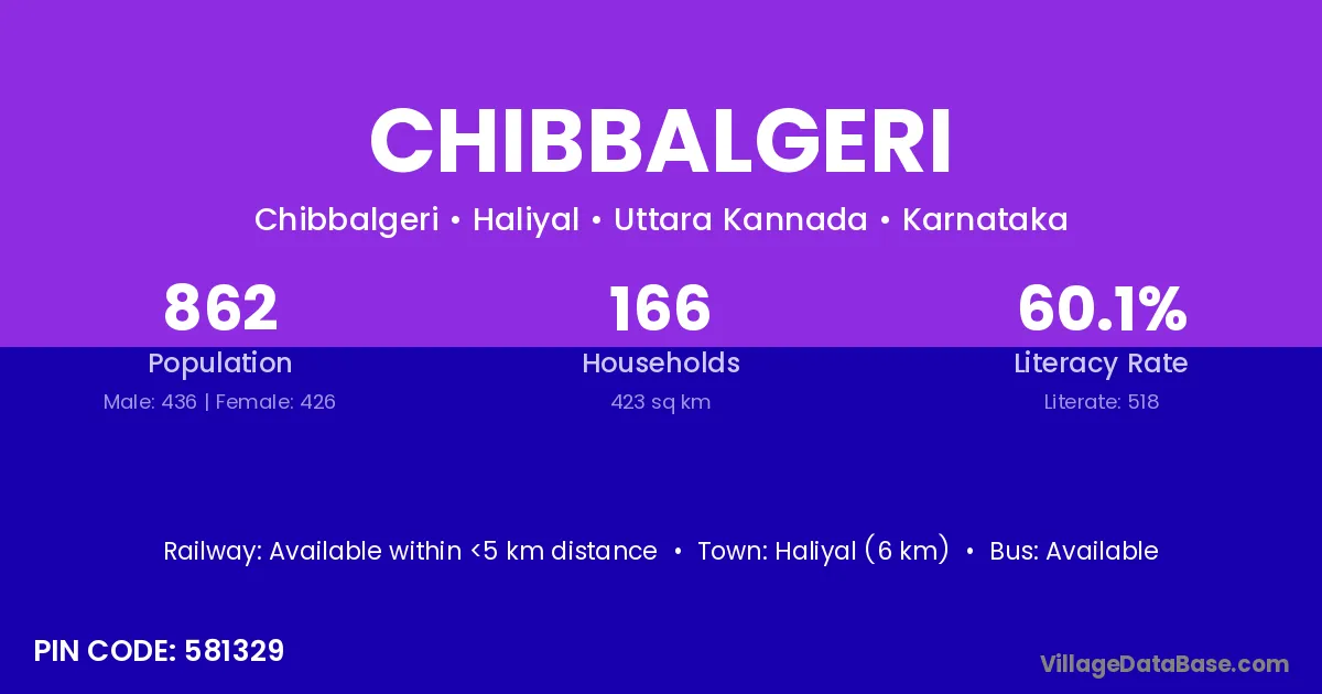 Haliyal (6 km) is the nearest town to Chibbalgeri village for major economic activities and is located approximately 6 km away.