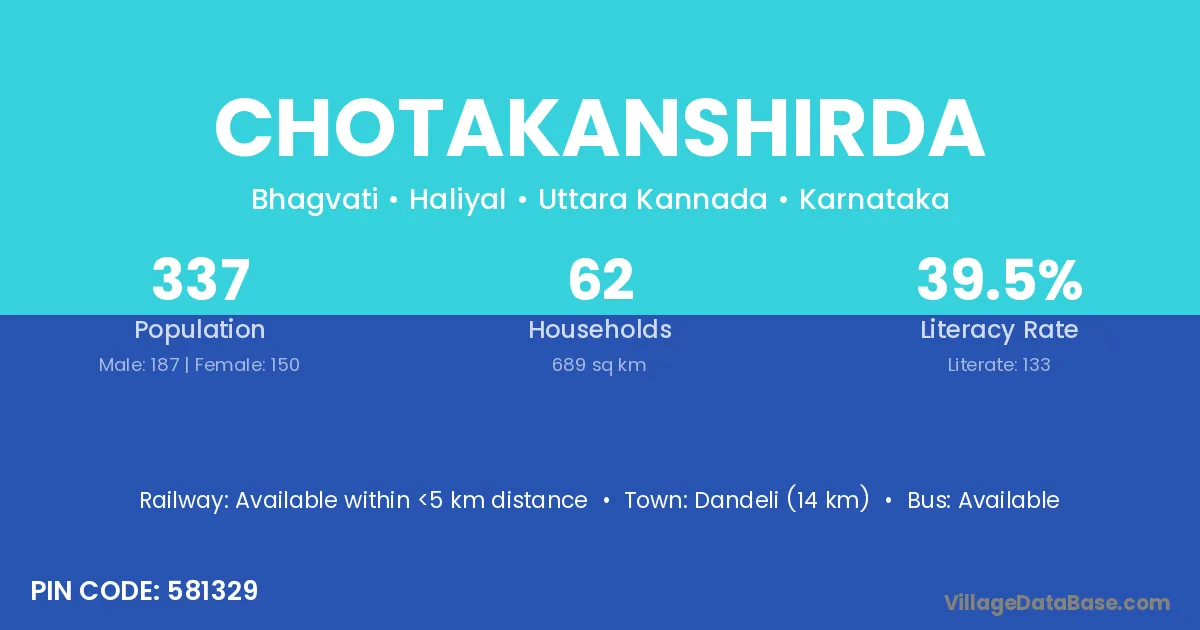 Dandeli (14 km) is the nearest town to Chotakanshirda village for major economic activities and is located approximately 14 km away.