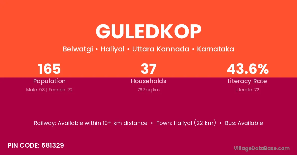 Haliyal (22 km) is the nearest town to Guledkop village for major economic activities and is located approximately 22 km away.