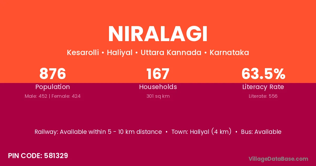 Haliyal (4 km) is the nearest town to Niralagi village for major economic activities and is located approximately 4 km away.