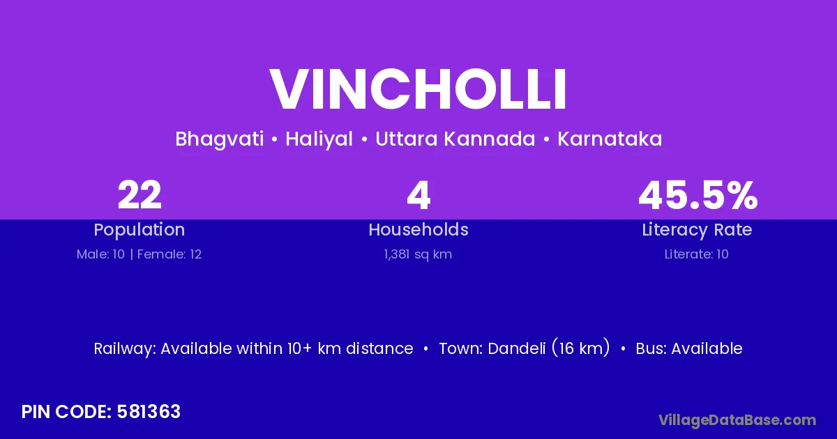 Dandeli (16 km) is the nearest town to Vincholli village for major economic activities and is located approximately 16 km away.