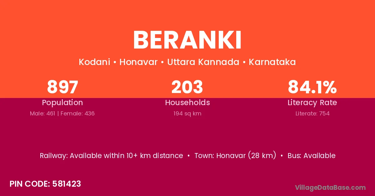 Honavar (28 km) is the nearest town to Beranki village for major economic activities and is located approximately 28 km away.