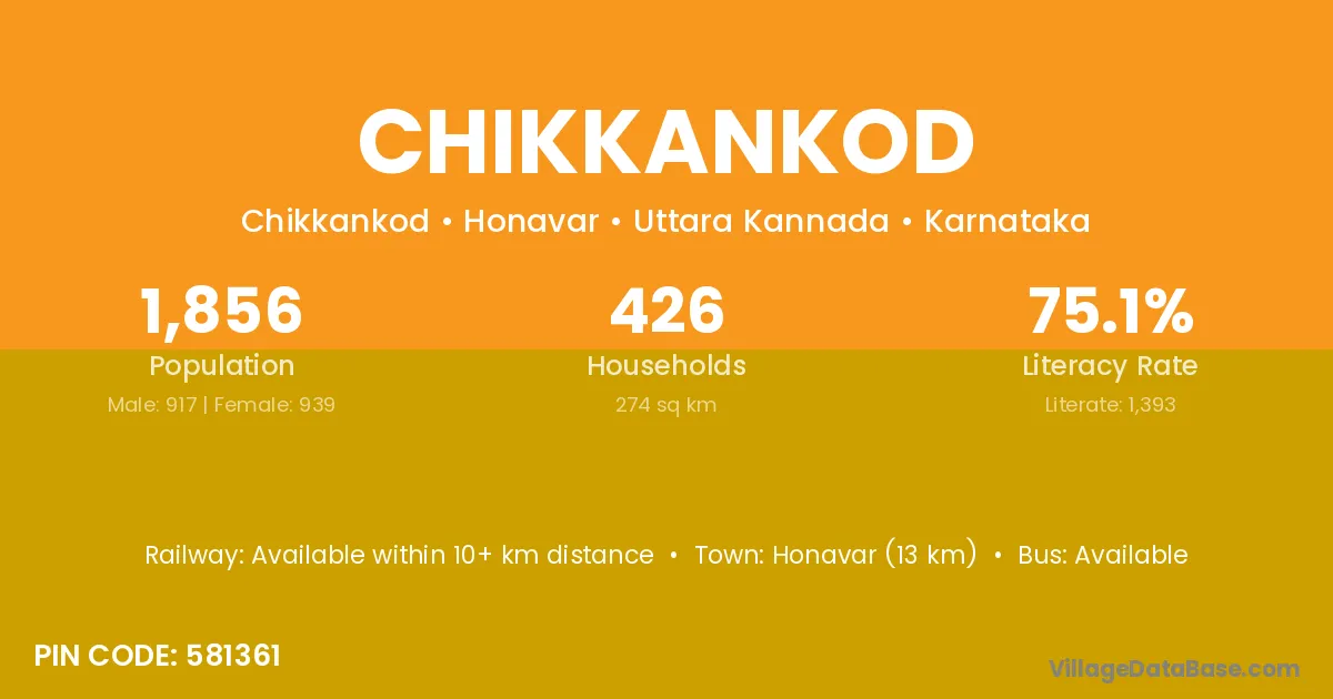 Honavar (13 km) is the nearest town to Chikkankod village for major economic activities and is located approximately 13 km away.