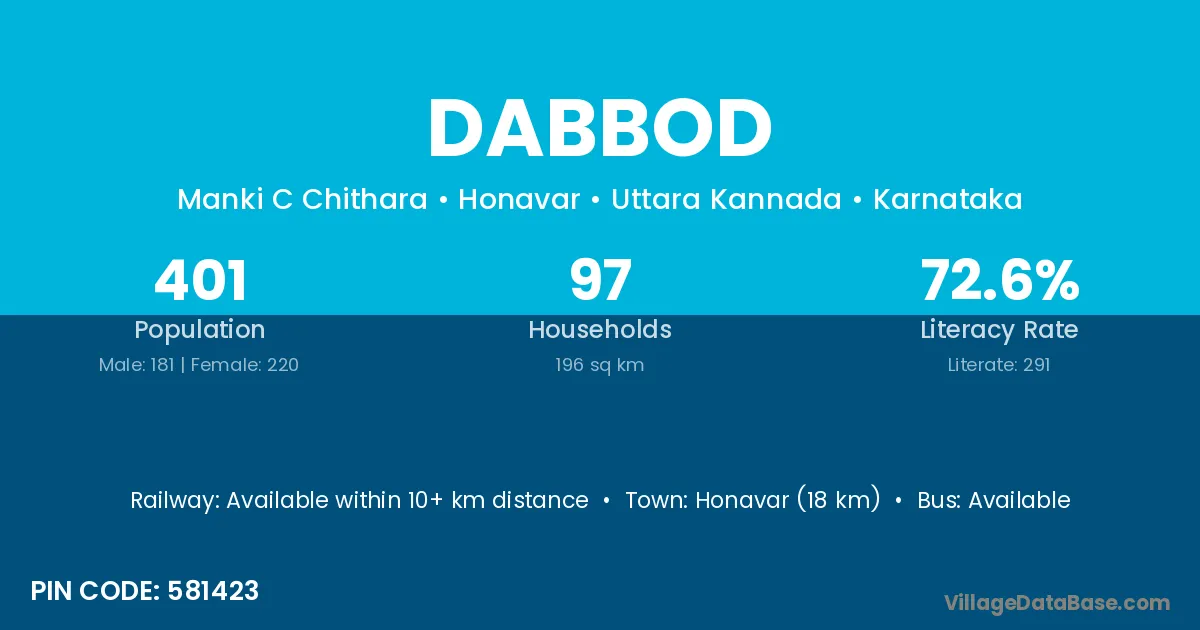 Honavar (18 km) is the nearest town to Dabbod village for major economic activities and is located approximately 18 km away.