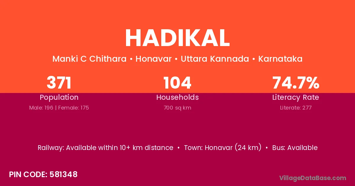 Honavar (24 km) is the nearest town to Hadikal village for major economic activities and is located approximately 24 km away.