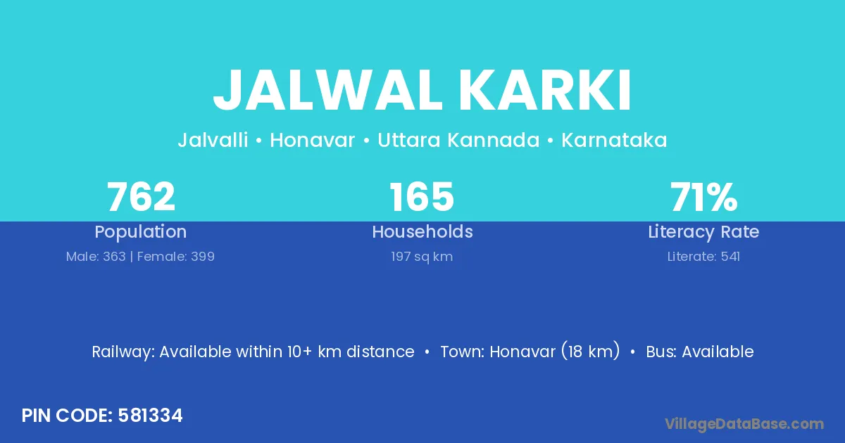 Honavar (18 km) is the nearest town to Jalwal Karki village for major economic activities and is located approximately 18 km away.