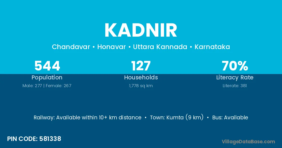 Kumta (9 km) is the nearest town to Kadnir village for major economic activities and is located approximately 9 km away.