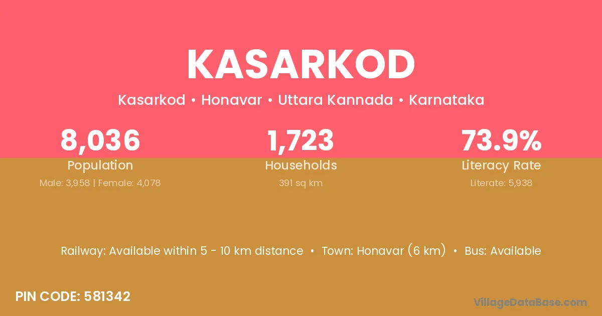 Honavar (6 km) is the nearest town to Kasarkod village for major economic activities and is located approximately 6 km away.
