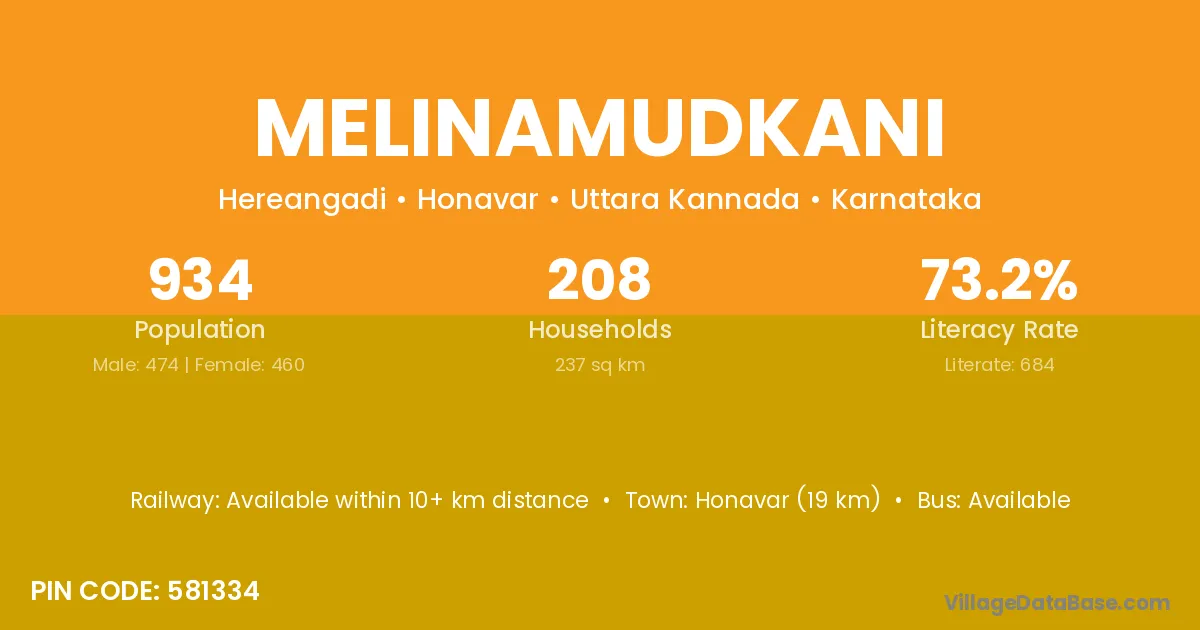 Honavar (19 km) is the nearest town to Melinamudkani village for major economic activities and is located approximately 19 km away.