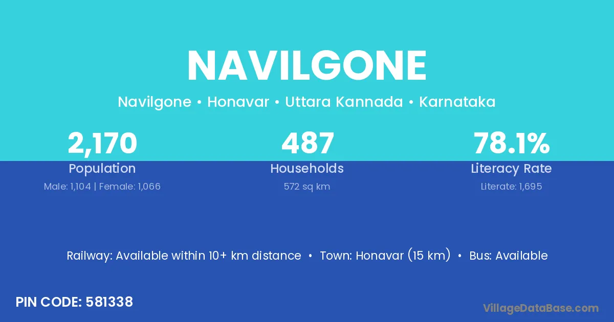 Honavar (15 km) is the nearest town to Navilgone village for major economic activities and is located approximately 15 km away.