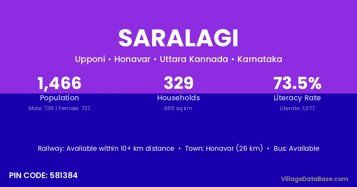 Honavar (26 km) is the nearest town to Saralagi village for major economic activities and is located approximately 26 km away.
