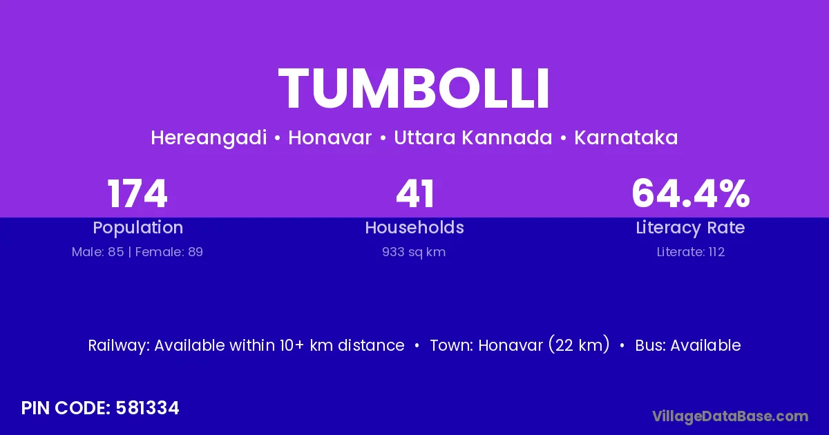 Honavar (22 km) is the nearest town to Tumbolli village for major economic activities and is located approximately 22 km away.