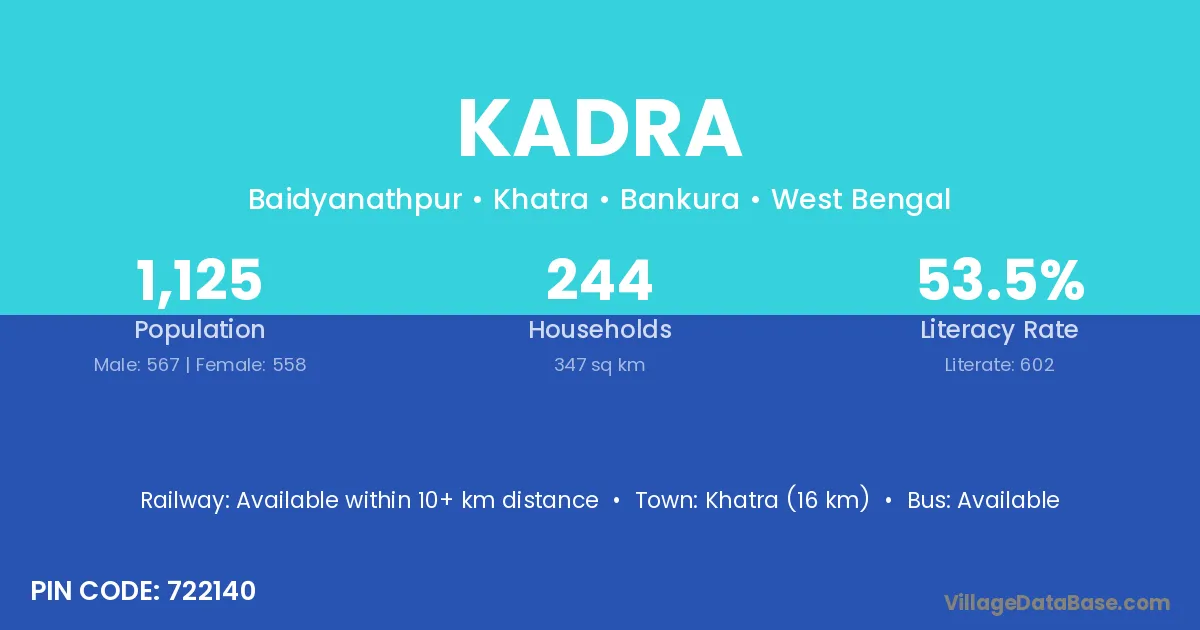 The literacy rate of Kadra village is 77.97%. Male literacy stands at 82.83% and female literacy at 72.97%.