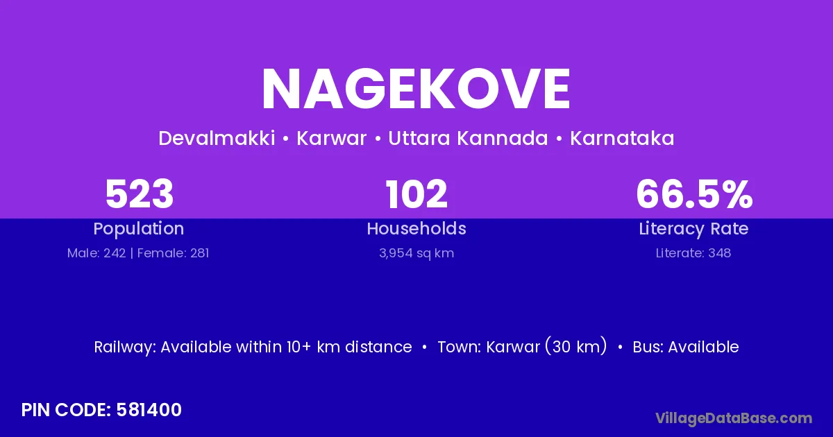 Karwar (30 km) is the nearest town to Nagekove village for major economic activities and is located approximately 30 km away.